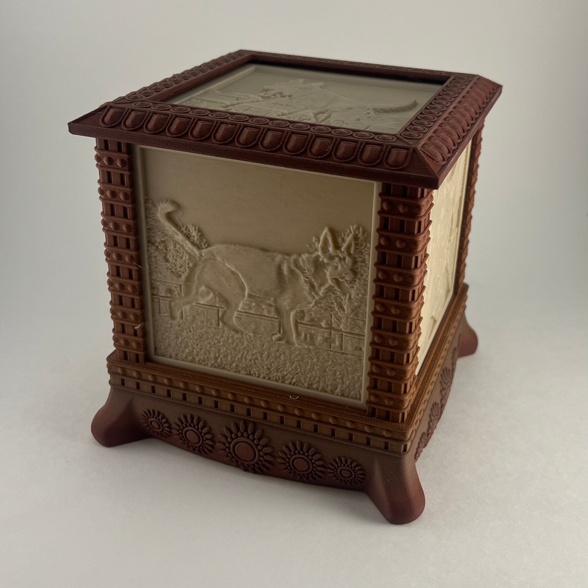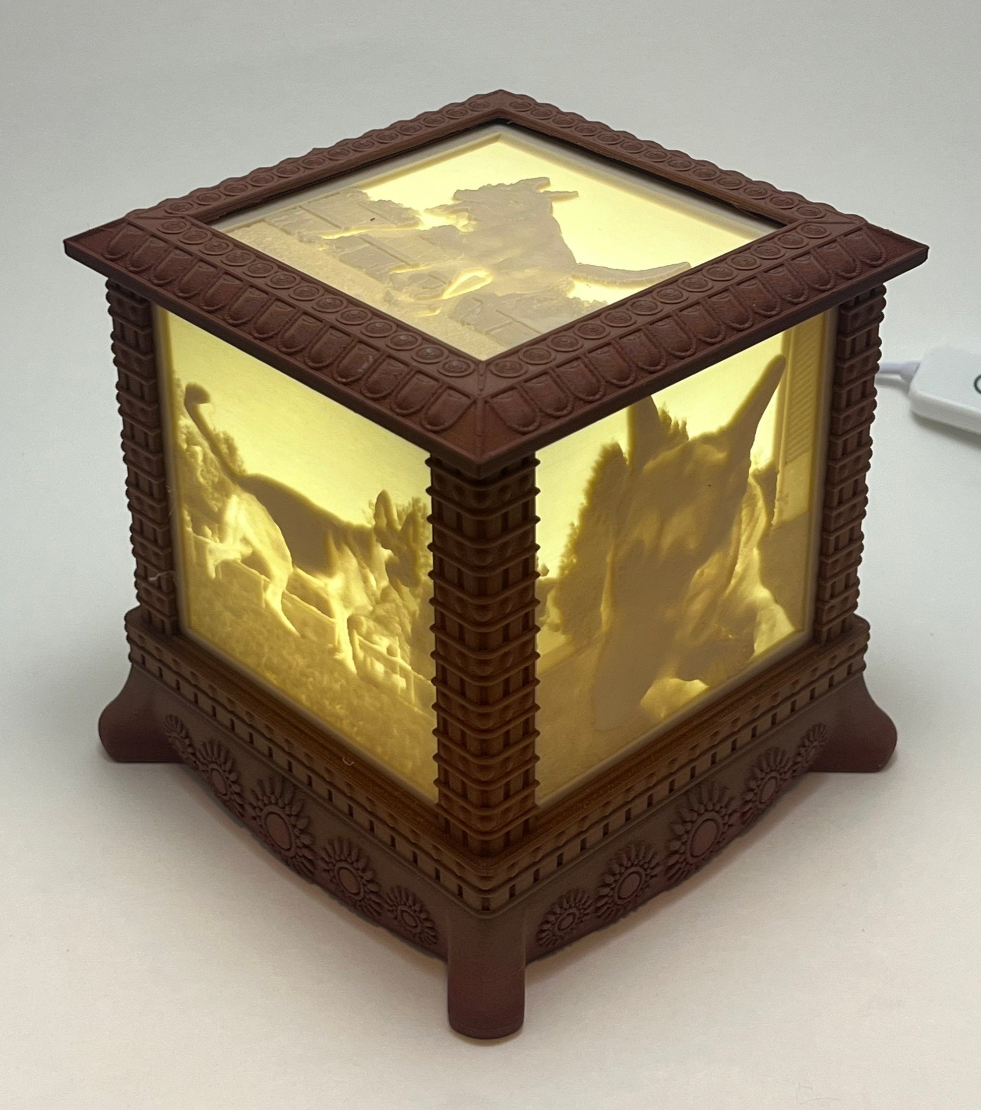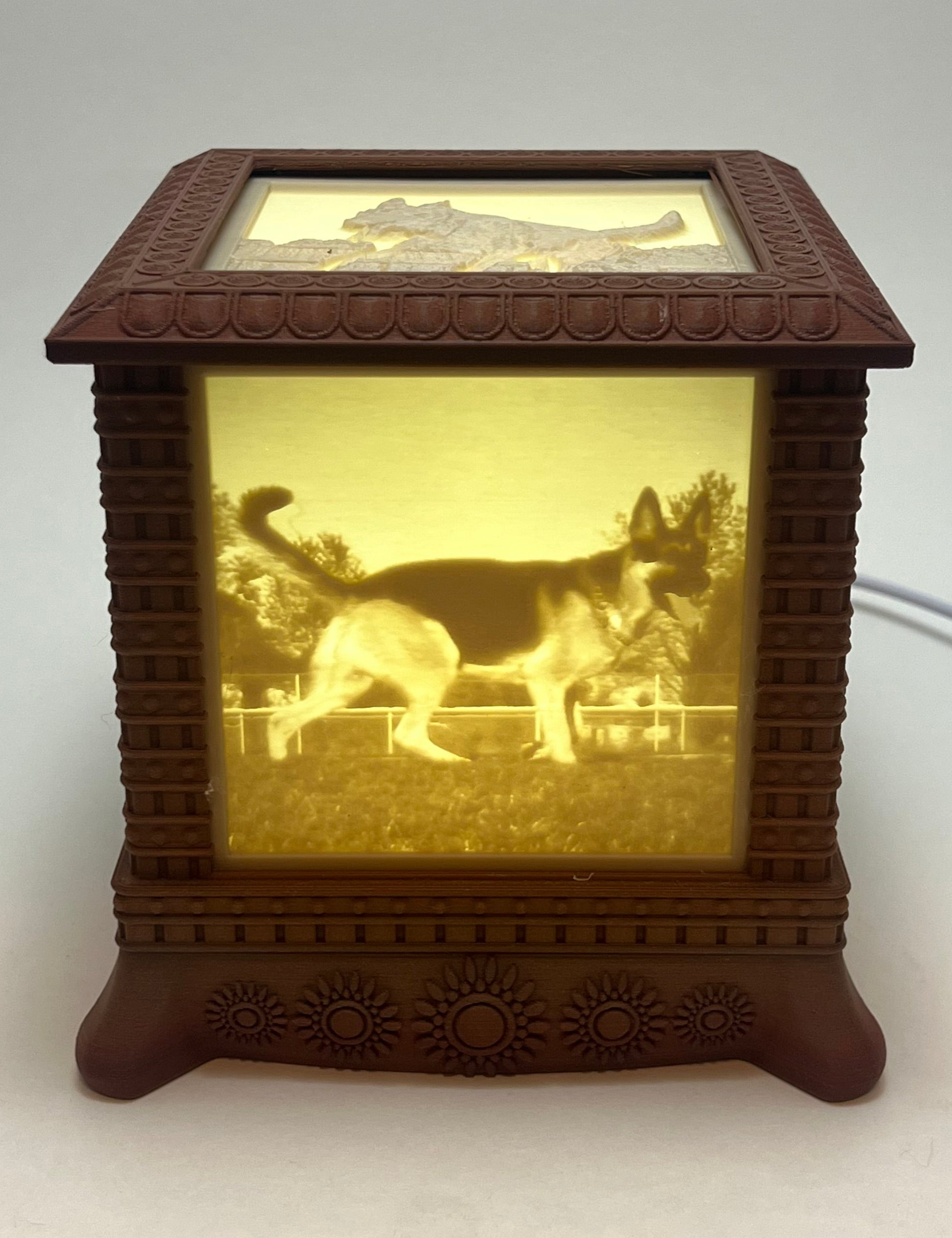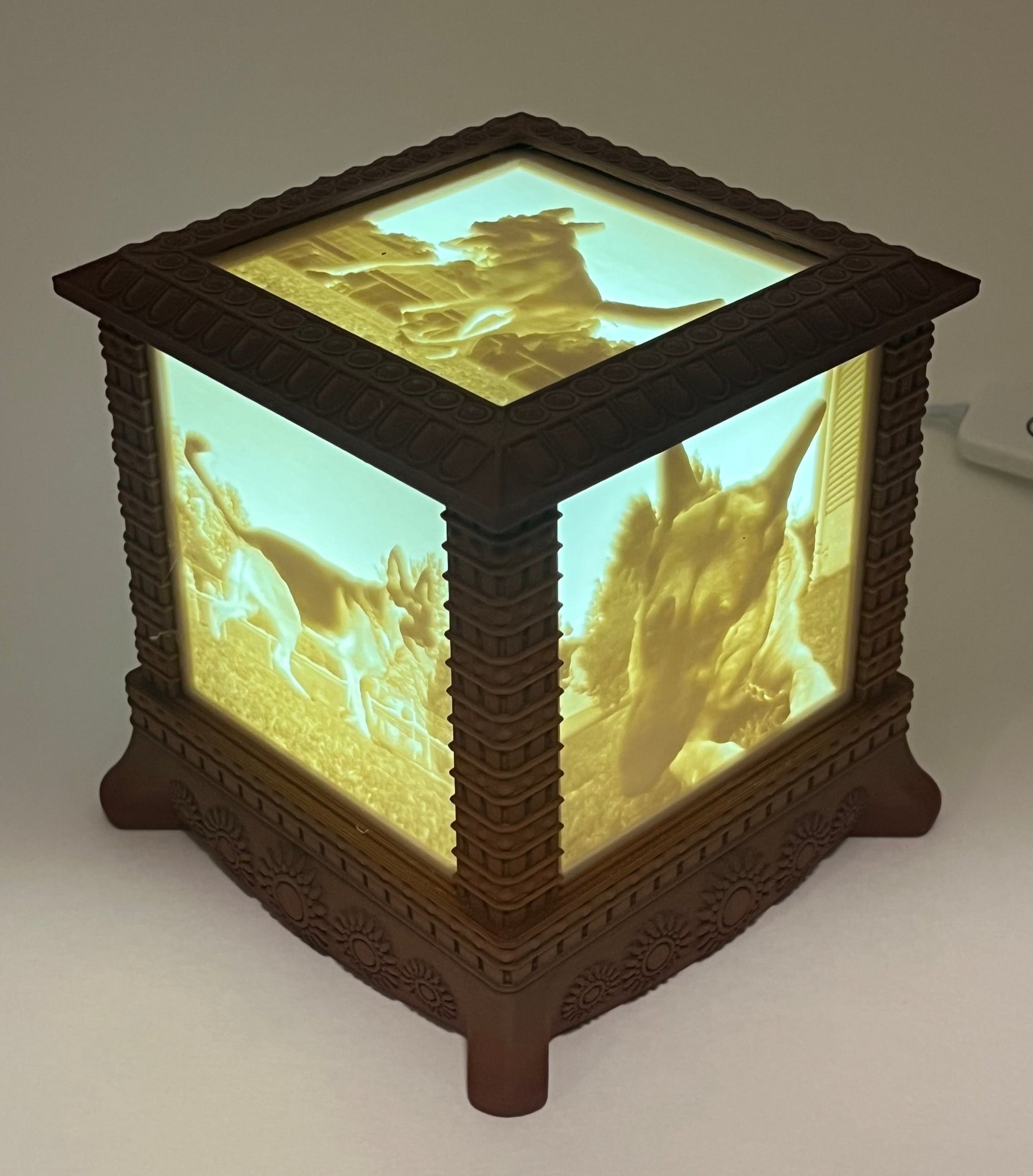 Choose your 5 most cherished photos to include in this gothic style lithophane photo box. Interchangeable photo plates allow you to arrange the photos however you choose. This USB powered LED photo light box is printed using premium wood PLA filaments and is available in a variety of wood finishes.